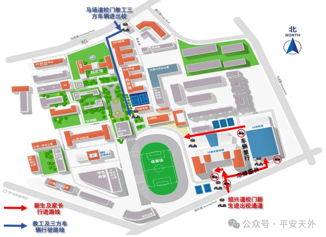 绍兴道校门:机动车辆禁止通行,原有机动车道变更为新生进出校专用通道,新生及家长可通过专用通道步行入校;