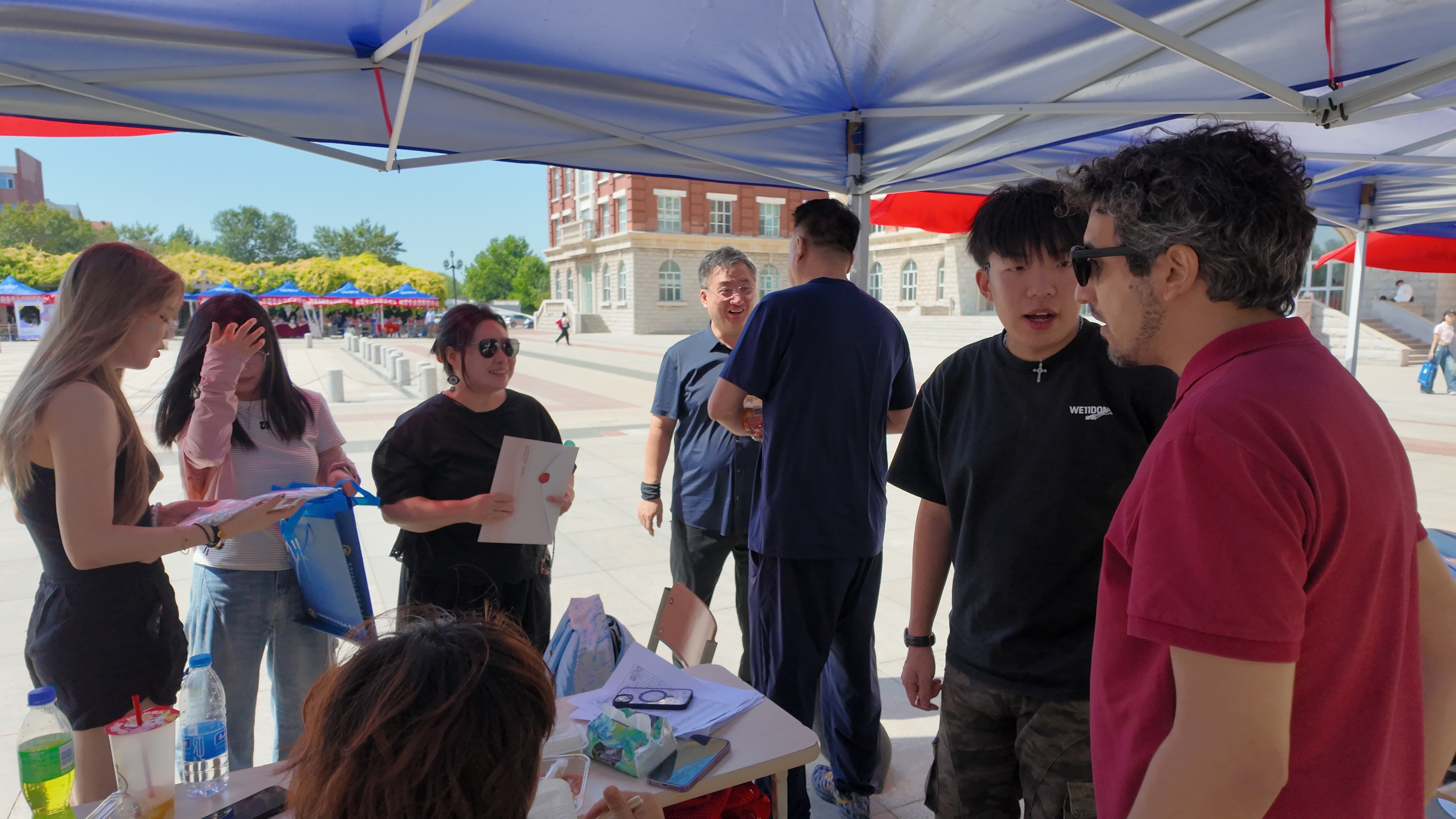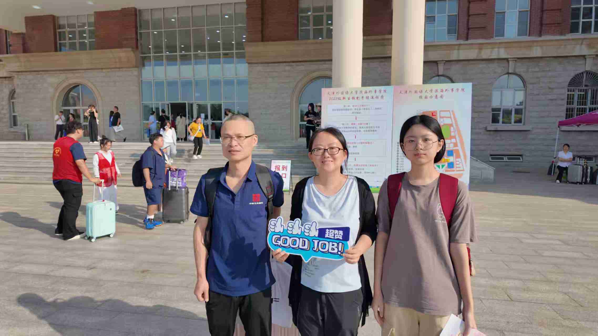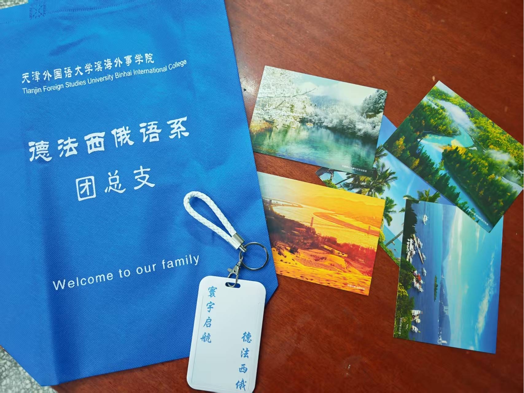 迎新现场,德语系、法语系、俄语系、西班牙语系等主要负责人及外籍教师与新生进行亲切交流,通过语言互动、文化展示等形式展现专业特色。团总支精心策划“寰宇启航”见面礼包,内含欧洲风景名胜明信片(背面由班代手写双语寄语)、专属文件袋及一卡通卡套钥匙扣,每一包礼品都经由学长学姐逐一精心检查。“钥匙扣和一卡通的卡套太实用了,学姐,谢谢你!”新生们的点赞,让在场的志愿者们露出了欣喜的笑容。