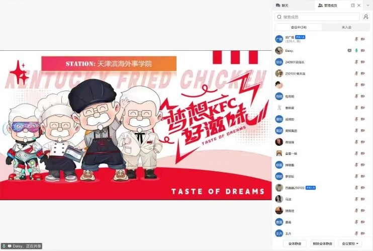 招聘会开场前,英语系通过带有腾讯会议二维码的主题海报发布参会信息,清晰标注企业名单与活动时间,方便学生提前预约参会。会议进程中,高顿教育则同步展示企业环境与业务布局,详解了财经教育领域的管培生、运营岗等岗位需求;天津肯德基以“梦想KFC 好滋味”为主题,通过卡通形象展示、岗位体系解读,介绍了门店运营、管理培训等岗位的成长路径与福利政策,两家企业均针对学生关注的跨专业求职、晋升通道等问题逐一回应。
