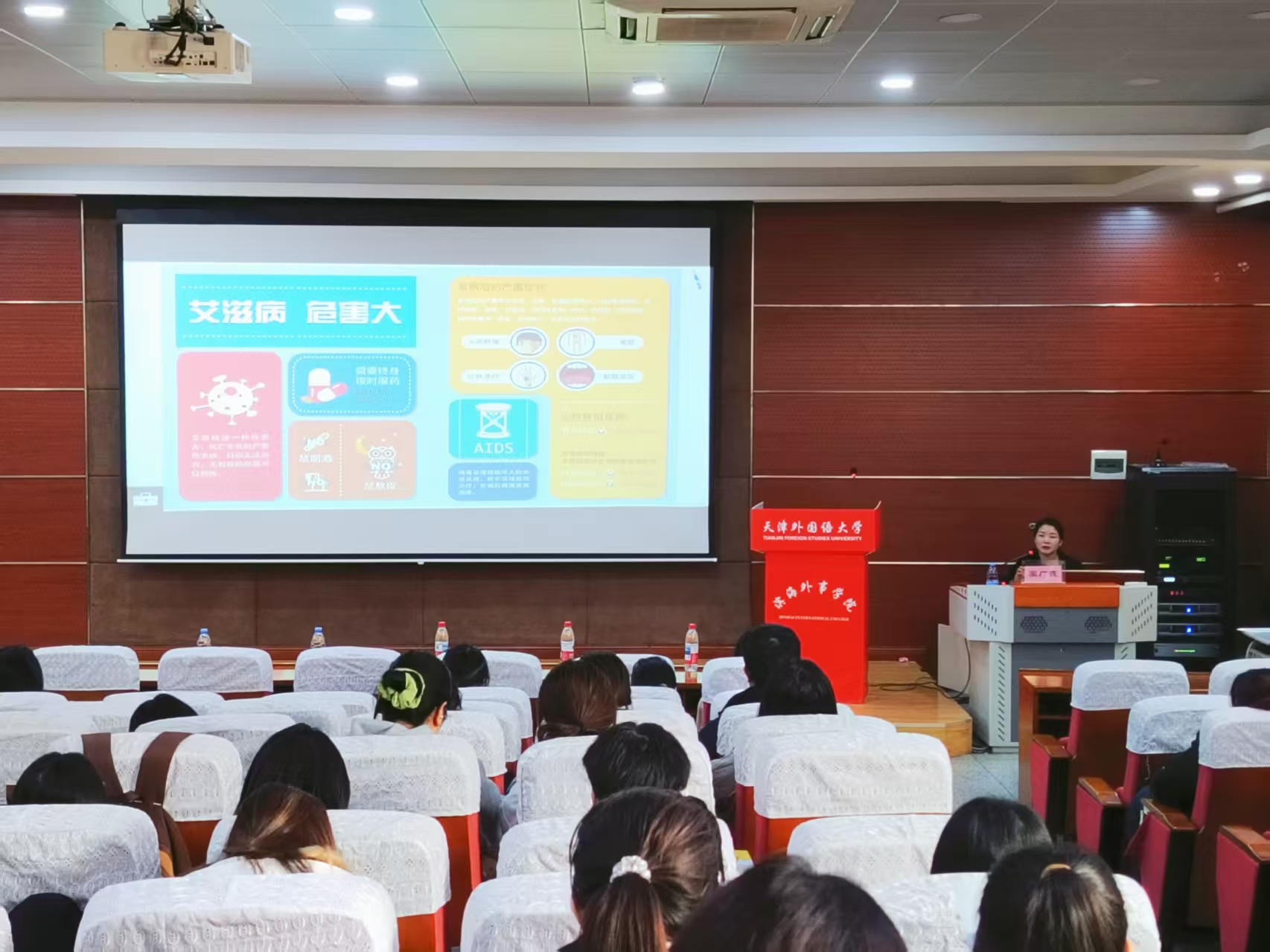 为进一步普及艾滋病防治知识,营造艾滋病防治的良好校园氛围,提高学生健康安全意识,帮助学生树立科学的防病观念,掌握必要的自我保护技能,10月24日,学工部邀请滨海新区疾控传染控制科窦广霞在第三教学楼104学术报告厅举办“守护青春,筑梦起航”预防艾滋病知识专题讲座,百余名师生到场参与。