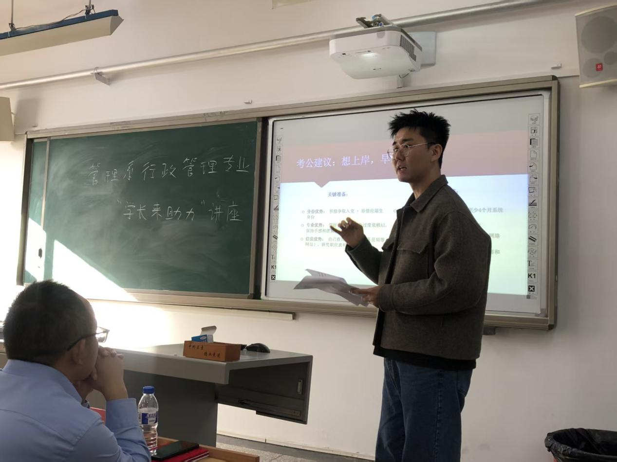 现场,校友结合大学时的学习经历与考公时的心得体会,分别从如何科学合理规划自己的大学学习生活、如何平衡学生干部管理工作与学习、如何进行有效的公务员考试复习等方面进行了分享。管理学系主任董红对行政管理专业的新生们寄予厚望,希望同学们能够以两位优秀学长为榜样,不辜负大学四年美好而短暂的学习生活,科学合理的规划自己的职业生涯,在毕业时交上一份满意的答卷。