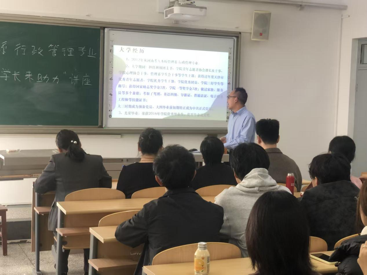 近期,管理学系举办了一场职业生涯交流会。此次交流会特别邀请了2016届校友李瑞强和王煜霄,他们分别就职于宝坻区市场监督管理局与天津市滨海新区检察院。