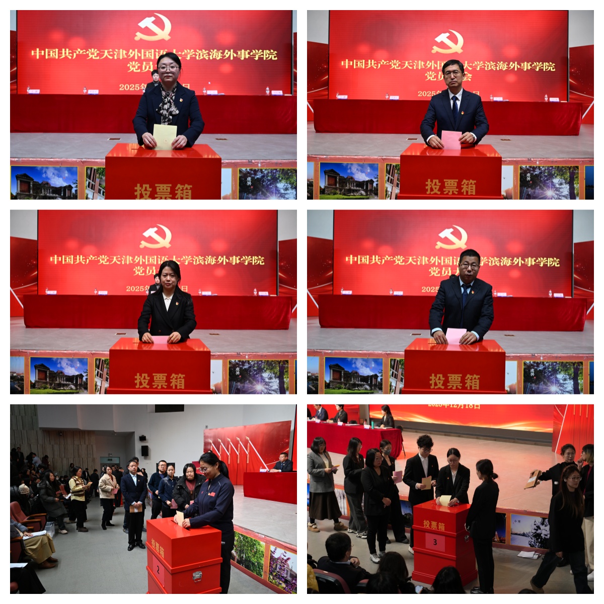 大会表决通过了《党员大会选举办法(草案)》、新一届党委委员和新一届纪委委员候选人名单、监票人名单,宣布了计票人名单。与会党员以无记名投票的方式,差额选举出由5人组成的新一届中共天津外国语大学滨海外事学院委员会和3人组成的新一届中共天津外国语大学滨海外事学院纪律检查委员会。