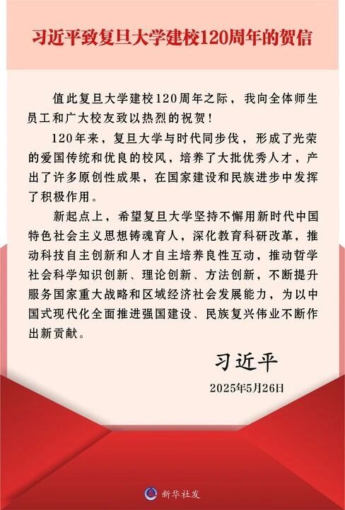 中共中央总书记、国家主席、中央军委主席习近平26日致信祝贺复旦大学建校120周年,向全体师生员工和广大校友致以热烈的祝贺。