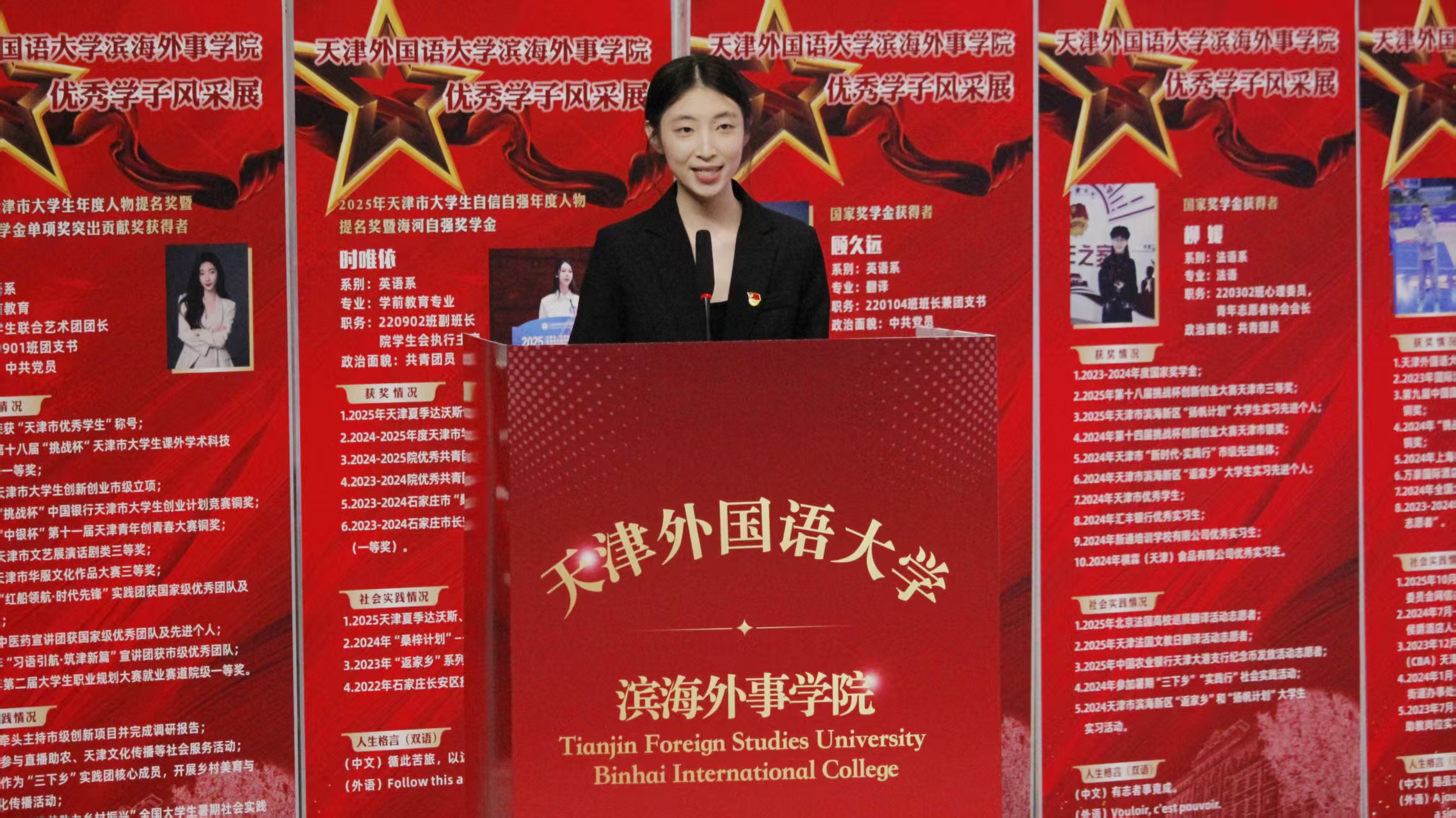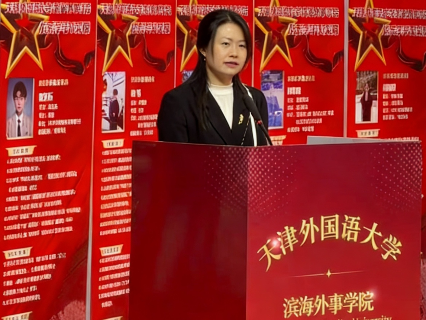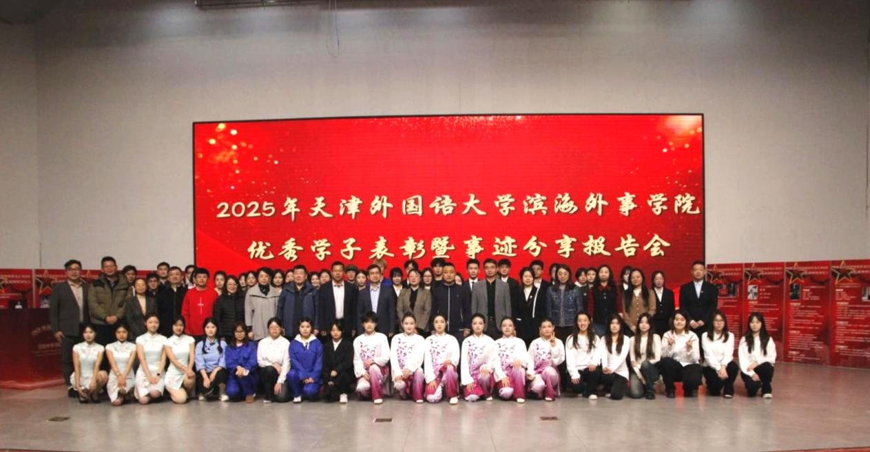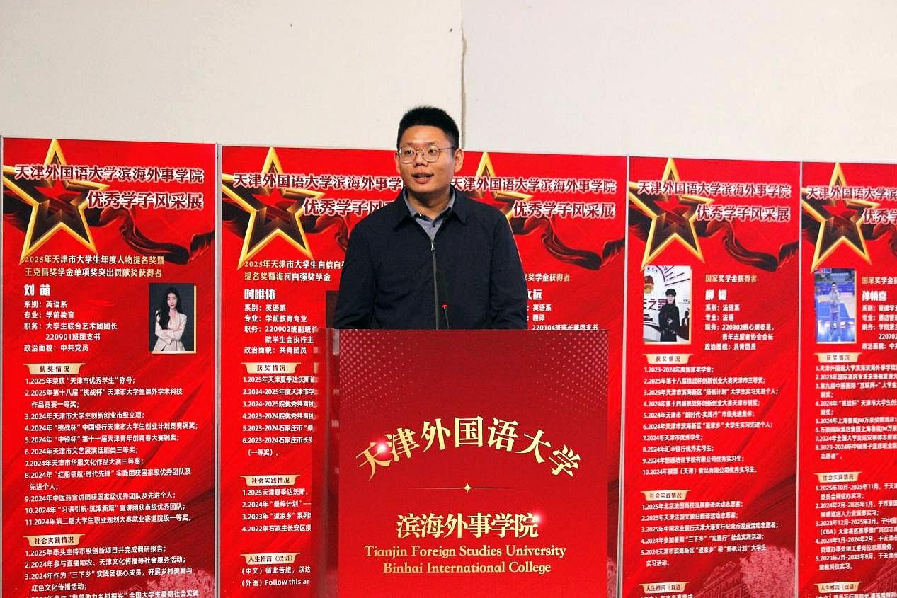奋斗正青春,榜样向未来。12月23日,天津外国语大学滨海外事学院2025年优秀学子表彰暨事迹分享报告会在主楼报告厅举行。天津渤海供应链管理有限公司业务副总经理齐之亮、天津市金色巨腾科技股份有限公司总经理王磊、2019届校友薛松义、全体院领导出席本次报告会。各教学单位主要负责同志、全体辅导员、400余名学生代表共同参与,一起见证属于滨外学子的青春华章。