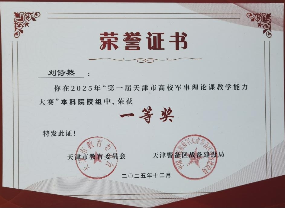 近日,由天津市教育委员会、天津警备区战备建设局联合举办的第一届天津市高校军事理论课教学能力大赛决赛在天津渤海职业技术学院圆满落幕。德法西俄语系辅导员刘诗然从全市46所高校的激烈角逐中脱颖而出,荣获一等奖。