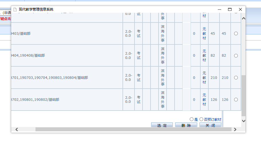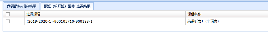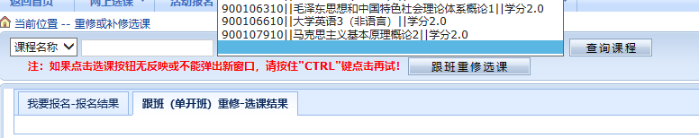 2. 选中课程后,点击跟班重修选课,在弹出的教学班列表中选择对应的教学班,点击选定(若选课按钮无响应或无法弹出窗口,可按住“CTRL”键再次点击尝试);